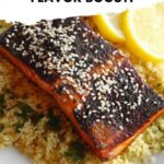 This Za’atar Roasted Salmon with Lemon recipe features succulent salmon fillets coated in a flavorful za’atar spice blend, then roasted to perfection in the oven. The salmon is brightened with fresh lemon zest and juice, and finished with chopped parsley. Served with couscous or your favorite side, this dish is a simple yet sophisticated meal perfect for a healthy dinner.